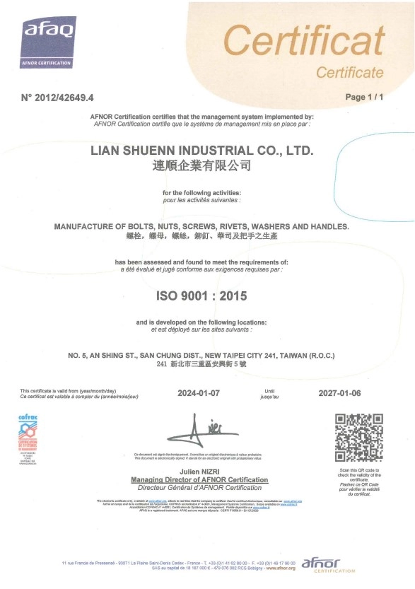 In choosing Lian Shuenn, you will have a qualified and reliable supplier of quality parts who is flexible in working with you and who provides the best after-sales support. When you have problems, we can also provide technical support. Lian Shuenn is famous for our quality control and commitment to high-quality products. Below is a list of our quality control equipment as well as our ISO 9000 certificate.